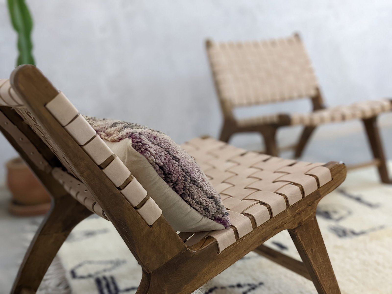 Le cuir utilisé provient directement par nos soins de Fès, la capitale du cuir. Sa qualité est tout à fait irréprochable et sa teinte subtile se marie parfaitement avec les couleurs chaudes et profondes du bois de noyer.