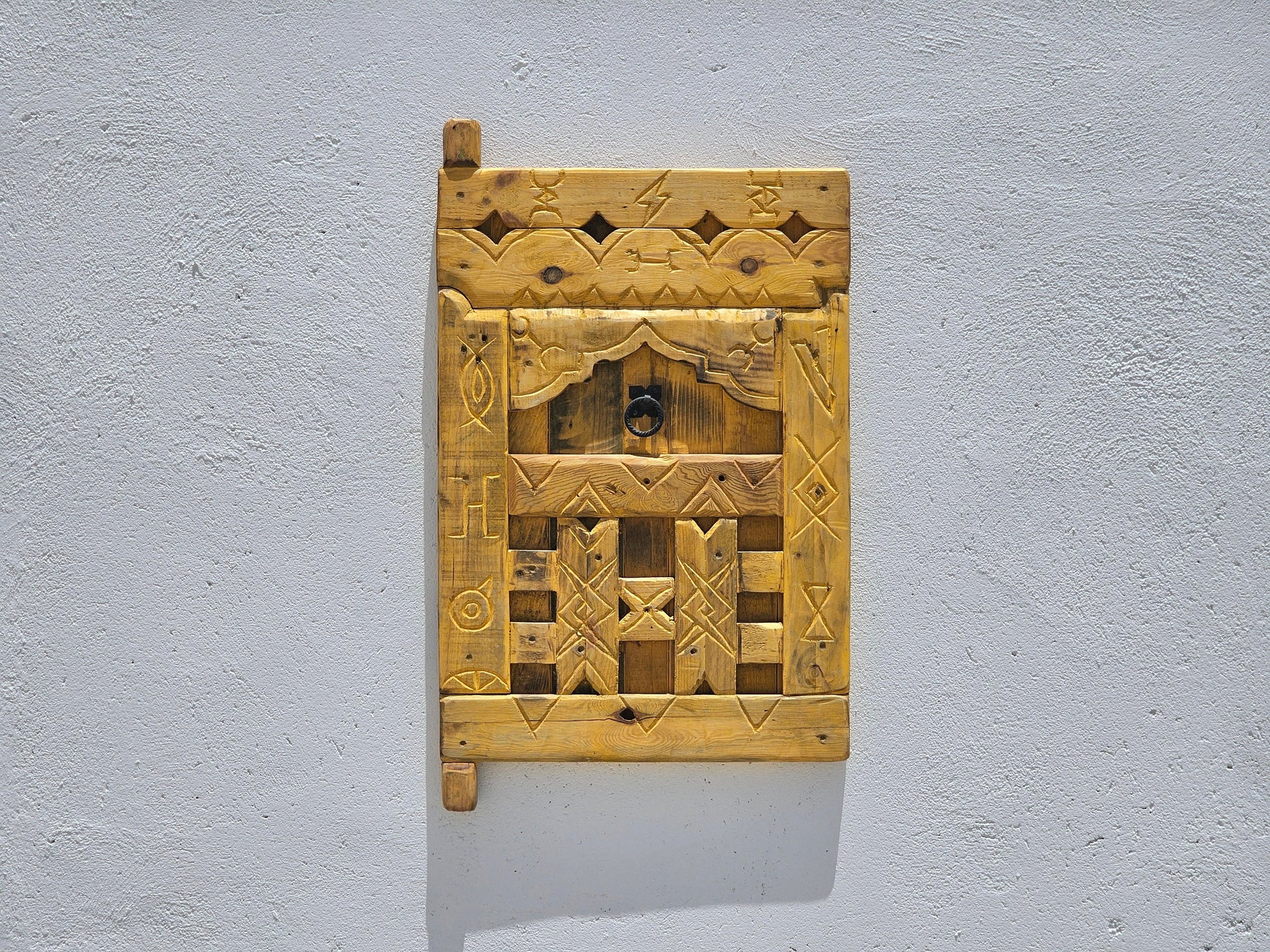 Nos tableaux en bois ancien sont fabriqués à partir de bois massif récupéré, minutieusement sculpté avec des motifs Amazighs authentiques, héritage vivant de notre culture.