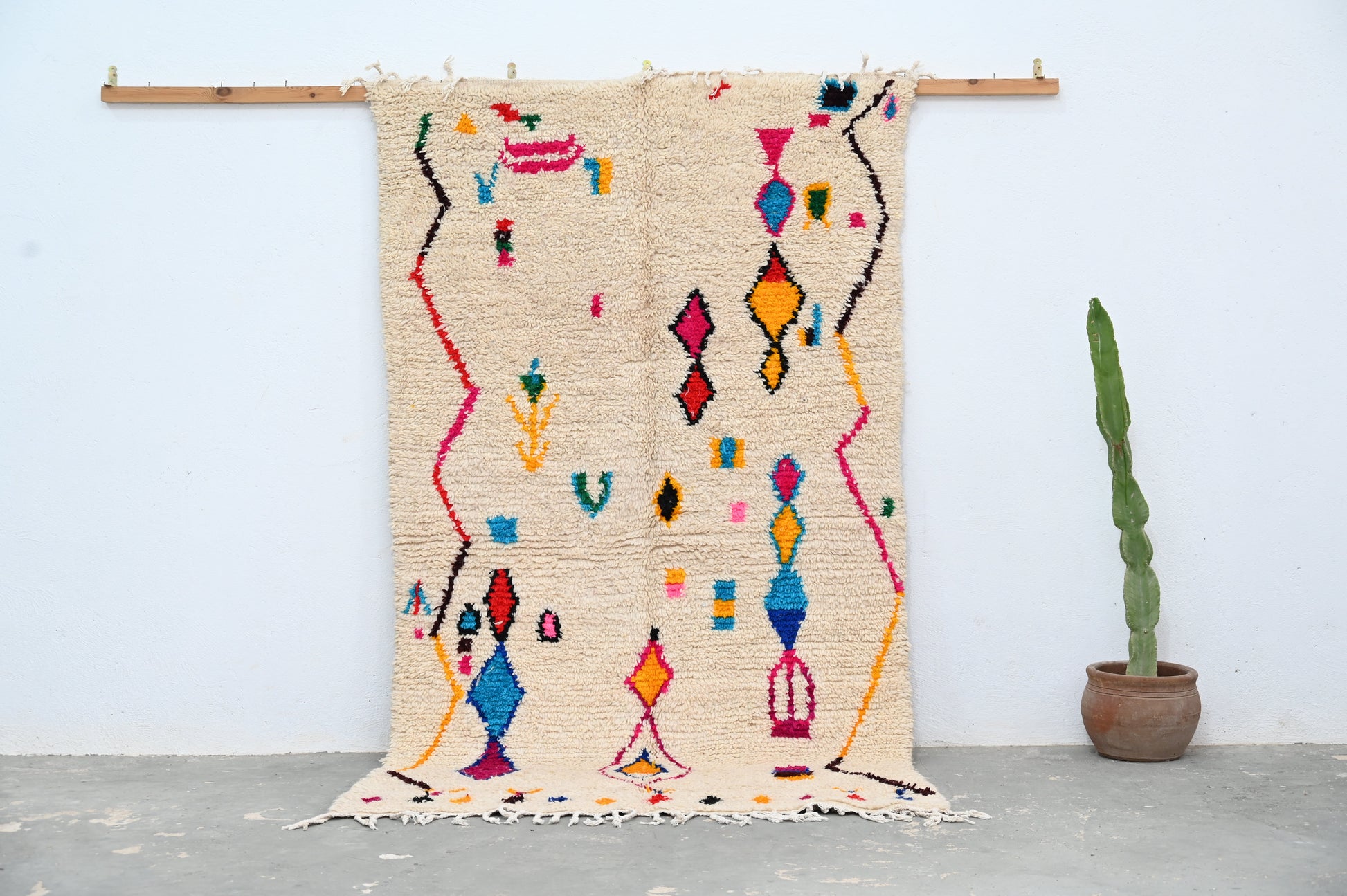 Découvrez notre splendide tapis coloré, une véritable œuvre d'art artisanale. Chaque tapis est confectionné avec passion à la main dans notre propre coopérative Baldi Chic, située au cœur des majestueuses montagnes de l'Atlas au Maroc. Fabriqué à partir de laine 100 % naturelle de brebis locales, ce tapis incarne la beauté de la nature. Les couleurs, toutes naturelles, reflètent la richesse du patrimoine culturel marocain. Chaque fil est tissé avec soin pour créer une palette de couleurs vibrantes qui illumineront votre intérieur. Notre tapis coloré est bien plus qu'un simple objet de décoration, c'est une expression de l'artisanat traditionnel marocain et de la créativité de nos artisans. Offrez-vous une pièce unique, riche en couleurs et en authenticité, avec notre tapis fait main.