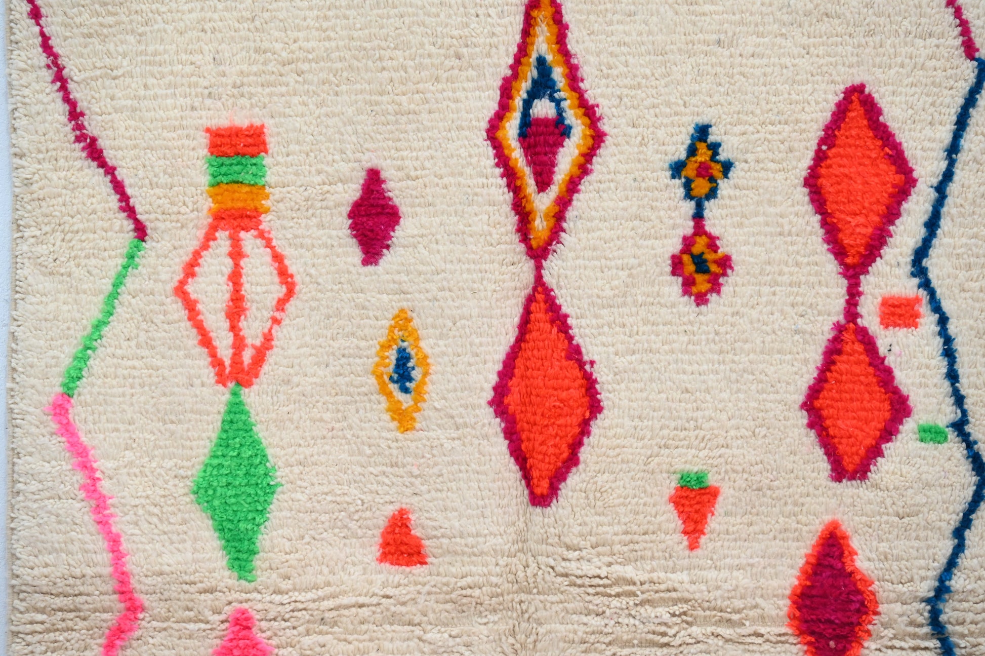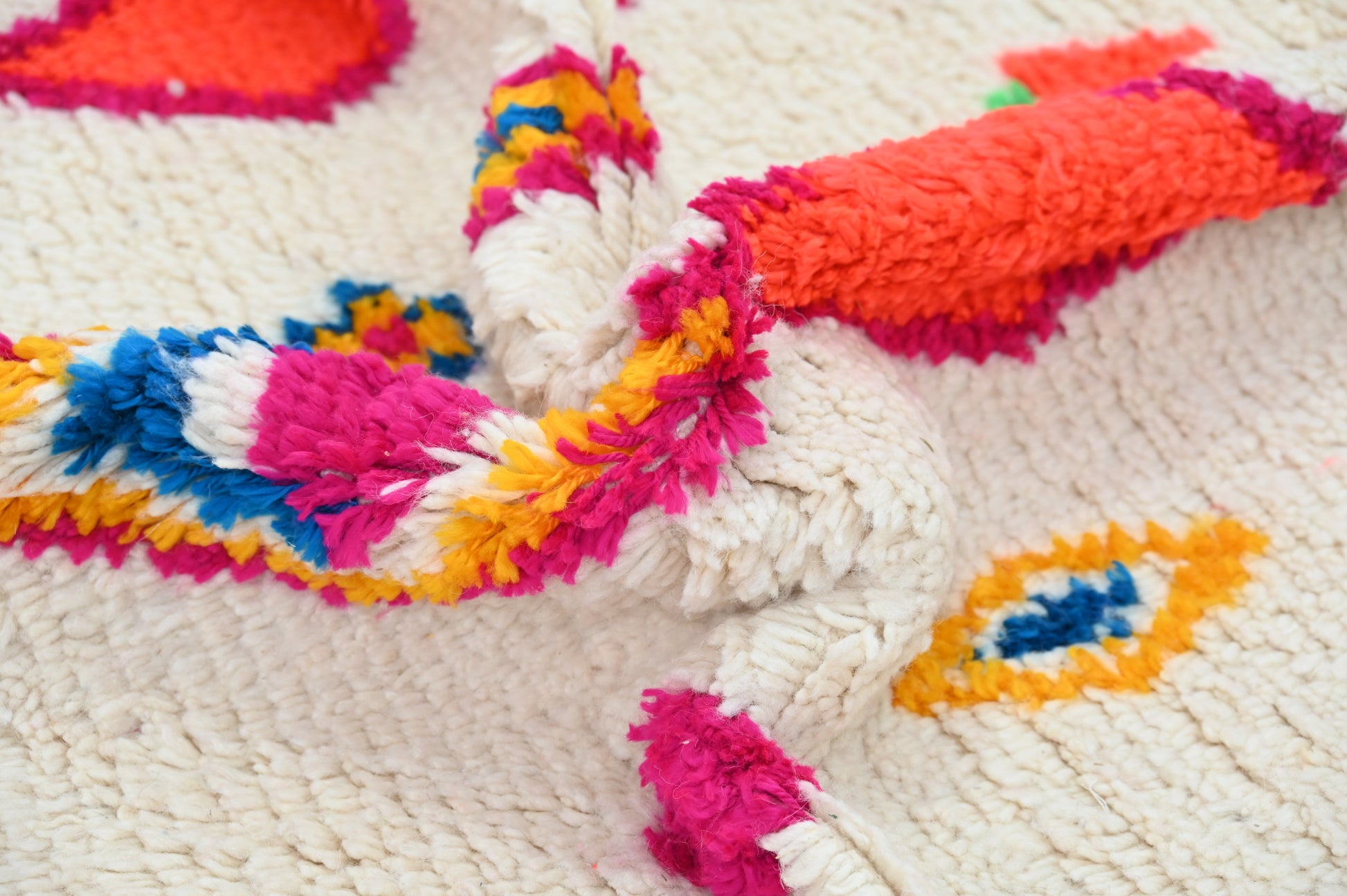 Découvrez notre splendide tapis coloré, une véritable œuvre d'art artisanale. Chaque tapis est confectionné avec passion à la main dans notre propre coopérative Baldi Chic, située au cœur des majestueuses montagnes de l'Atlas au Maroc. Fabriqué à partir de laine 100 % naturelle de brebis locales, ce tapis incarne la beauté de la nature. Les couleurs, toutes naturelles, reflètent la richesse du patrimoine culturel marocain. Chaque fil est tissé avec soin pour créer une palette de couleurs vibrantes qui illumineront votre intérieur. Notre tapis coloré est bien plus qu'un simple objet de décoration, c'est une expression de l'artisanat traditionnel marocain et de la créativité de nos artisans. Offrez-vous une pièce unique, riche en couleurs et en authenticité, avec notre tapis fait main.
