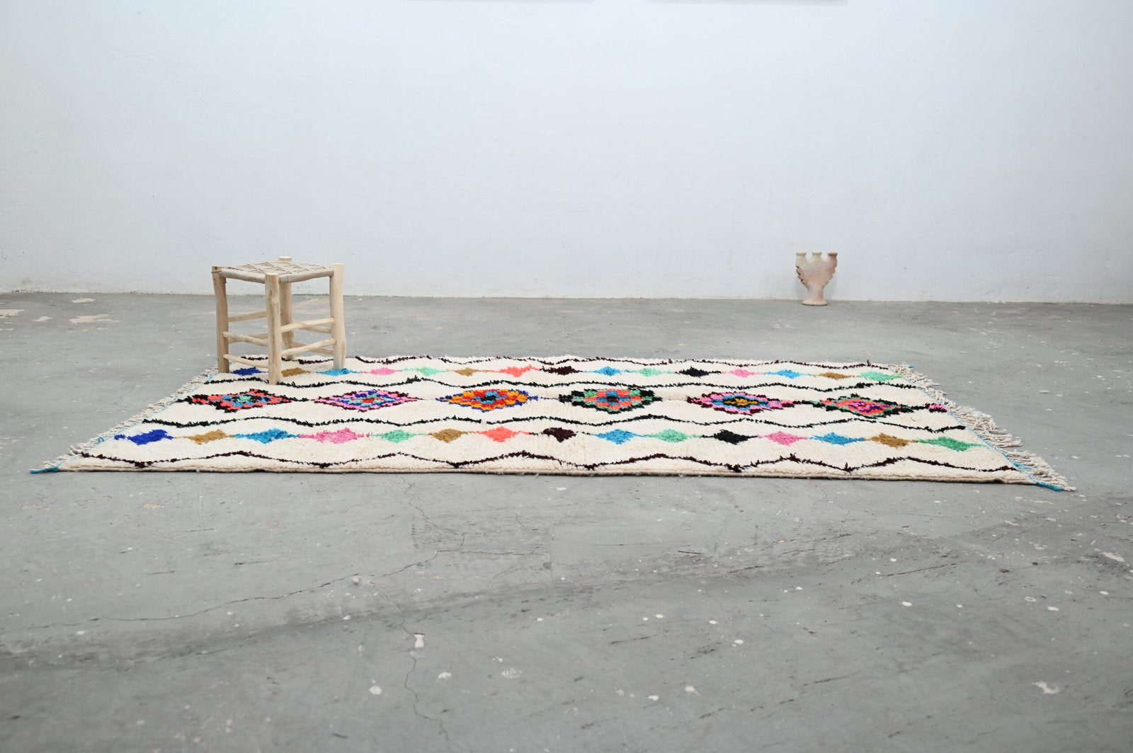 Découvrez notre splendide tapis coloré, une véritable œuvre d'art artisanale. Chaque tapis est confectionné avec passion à la main dans notre propre coopérative Baldi Chic, située au cœur des majestueuses montagnes de l'Atlas au Maroc. Fabriqué à partir de laine 100 % naturelle de brebis locales, ce tapis incarne la beauté de la nature. Les couleurs, toutes naturelles, reflètent la richesse du patrimoine culturel marocain. Chaque fil est tissé avec soin pour créer une palette de couleurs vibrantes qui illumineront votre intérieur. Notre tapis coloré est bien plus qu'un simple objet de décoration, c'est une expression de l'artisanat traditionnel marocain et de la créativité de nos artisans. Offrez-vous une pièce unique, riche en couleurs et en authenticité, avec notre tapis fait main.