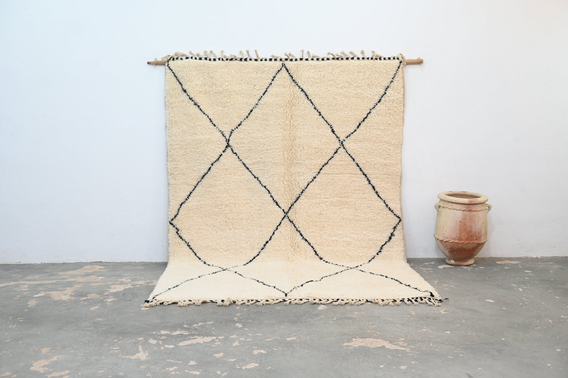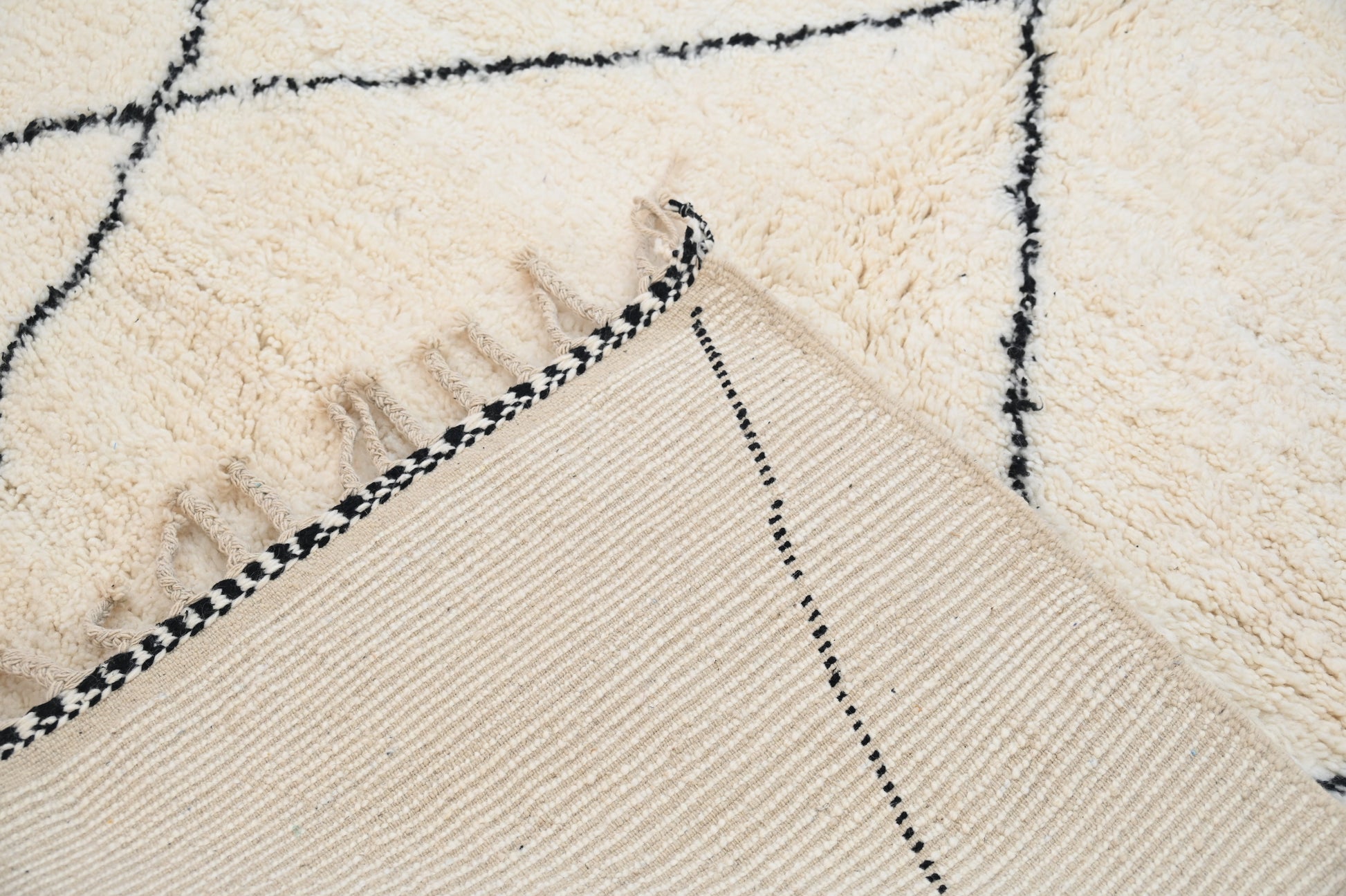 Découvrez nos magnifiques tapis Beni Ouarain, de véritables trésors artisanaux. Chaque tapis est soigneusement tissé à la main sur un métier à tisser, en suivant la technique ancestrale de nos ancêtres amazighs, dans notre propre coopérative BaldiChic, nichée au cœur des majestueuses montagnes de l'Atlas au Maroc. Fabriquées à partir de laine naturelle de brebis locales de l'Atlas, ces pièces uniques combinent la tradition et le luxe. Leur douceur et leur qualité luxueuse vous envelopperont de confort et d'élégance. Chaque tapis Beni Ouarain raconte une histoire, reflète le savoir-faire ancestral de nos artisans et apportera une touche d'authenticité marocaine à votre intérieur. Offrez-vous le raffinement et la chaleur du Maroc avec nos tapis Beni Ouarain. Chaque tapis incarne le charme de la tradition et l'opulence du naturel.